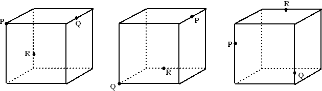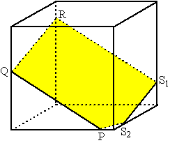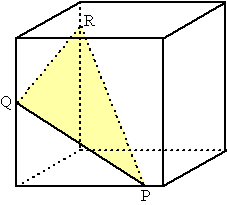 Dat die doorsnede nog niet klaar is, kun je zien aan het feit dat lijn pr niet in een grensvlak van de kubus ligt, maar er `doorheen` loopt. . In het meest eenvoudige geval is de driehoek pqr meteen ook de doorsnede van het vlak met de kubus.