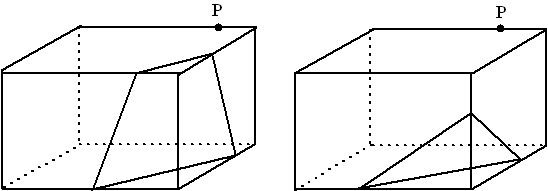 Neem de kubus hiernaast, waarin je dolgraag de doorsnede van het vlak door p, q en r met de kubus wilt tekenen.. In het meest eenvoudige geval is de driehoek pqr meteen ook de doorsnede van het vlak met de kubus. Doorsnede van een kubus met een vlak teken telkens de doorsnede van de gegeven kubus met vl(ijk). Dat die doorsnede nog niet klaar is, kun je zien aan het feit dat lijn pr niet in een grensvlak van de kubus ligt, maar er `doorheen` loopt. We vinden de doorsnede als volgt:. De punten p, q en r liggen in op ribben in twee aangrenzende zijvlakken.